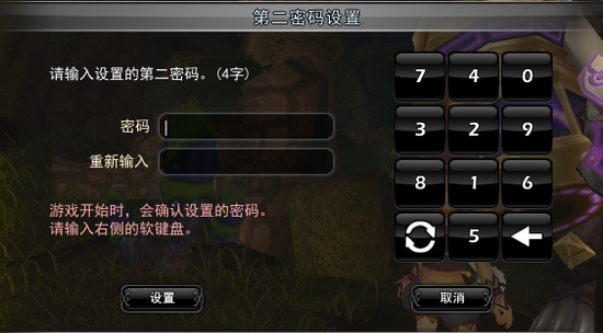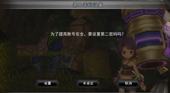 按[开始游戏]后,出现是否设定二次密码。按[设定]可建立二次密码, 按[不设定]之间进入游戏。
